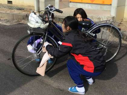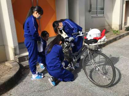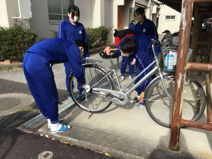 3年生の技術科の学習では、学んだことを生かして自転車の整備をしました。車輪の回り方を確認しながら、錆がとれるようにスプレーをかけ、協力して磨いていました。