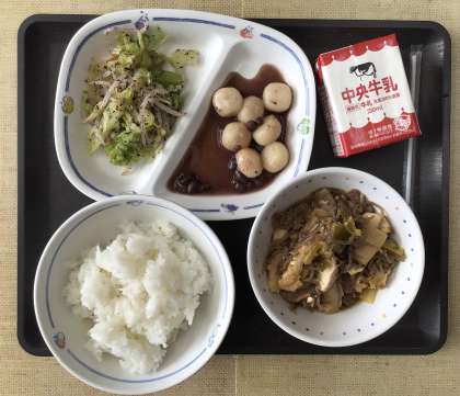 今日の献立は、「鏡開き献立」で、ごはん、すき焼き風煮、ゆかり和え、ぜんざい、牛乳、でした。エネルギー:854kcal
