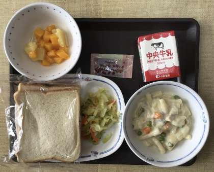 今日の献立は、スライスパン、マカロニのクリーム煮、フレンチサラダ、ミックスフルーツ、メープルジャム、牛乳、でした。エネルギー:859kcal