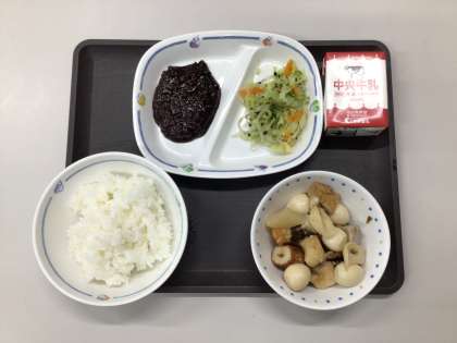 今日の献立は、ごはん、おでん、青菜和え、肉味噌、牛乳、でした。エネルギー:836kcal