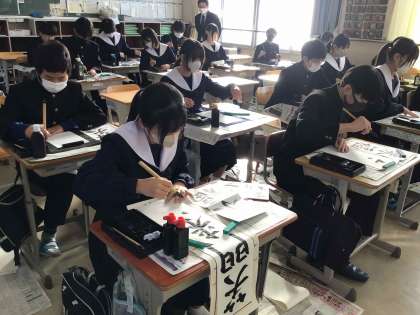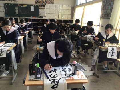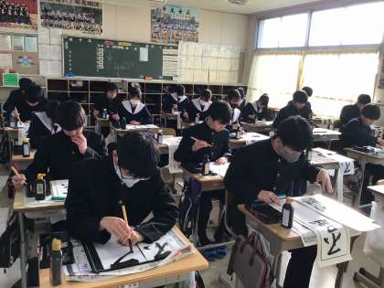 冬休みに練習した成果を発揮し、作品を書き上げました。提出された作品は、校内に掲示する予定です。