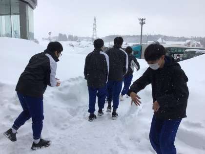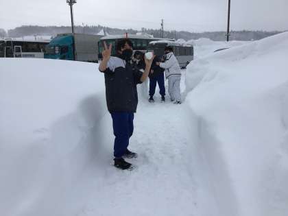 バスレクの係が工夫を凝らしたビンゴやお絵描きクイズで盛り上がりました。雪がかなり多いですが、9時15分にひるがの高原サービスエリアに到着しました。積もった雪におおはしゃぎの生徒たちです。