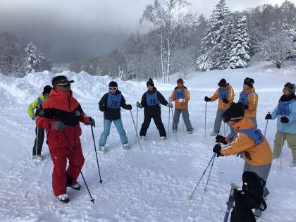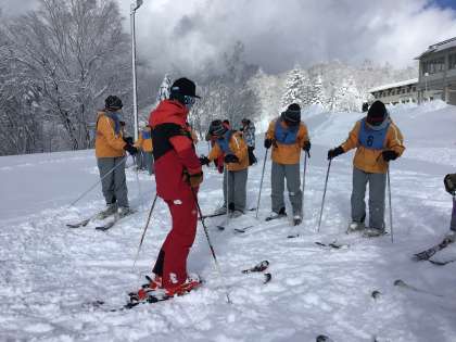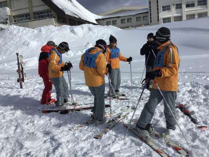 スキー班に分かれてインストラクターから丁寧に指導を受けています。乗鞍は今年度いちばんの寒さだそうですが、研修に参加している生徒は真剣な表情で説明を聞いています。