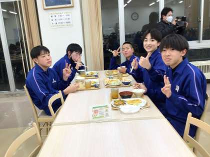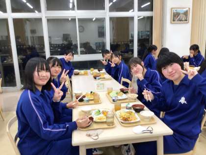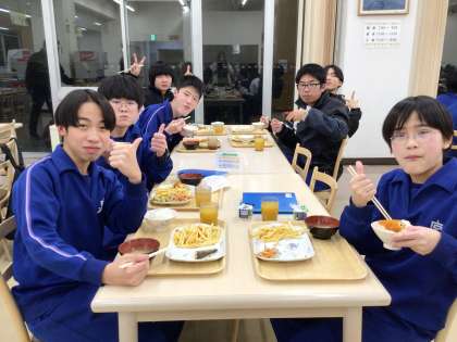 入浴を済ませ、食事をしています。ポテトが大人気です。山盛りのおかわりをしている生徒もいます。