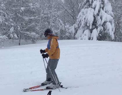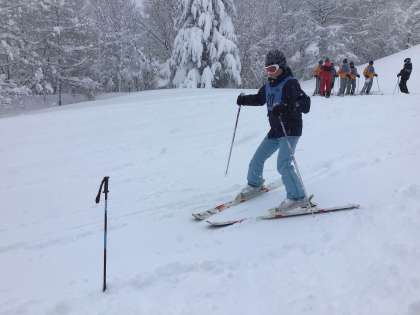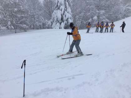 午前中のスキー研修の様子です。頬にあたる風や雪が冷たかったですが、どんどん上達しています。徐々に天気は回復してきています。
