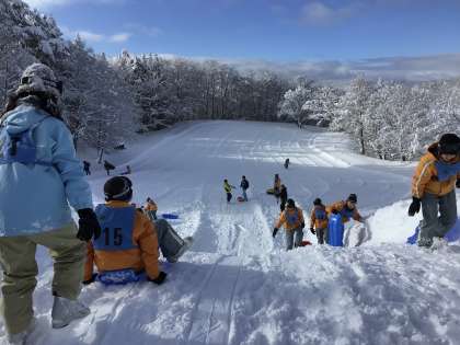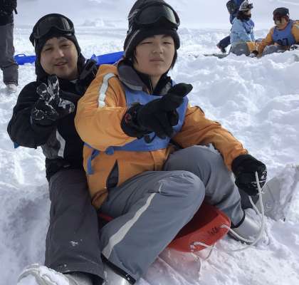 素早い動きで生み出したスキー研修前の時間、そり遊びを楽しみました。「めっちゃ楽しい!」と喜んでいる生徒の笑顔がありました。