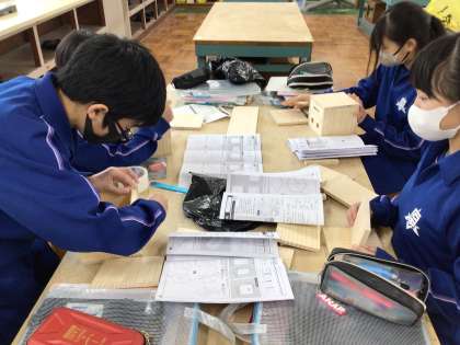 1年2組の技術科では、木製BOXの仮組みと、釘の下穴あけが進んでいます。