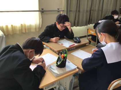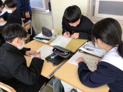 高校入試が始まりました。合格をもらい、安心した表情の3年生もいます。1・2年生も、間近に迫った学習診断テストに向けて、必要な知識が身に付いているか授業で確認する時間が増えてきました。理科では、学習プリントを使い、教え合いながら復習していました。