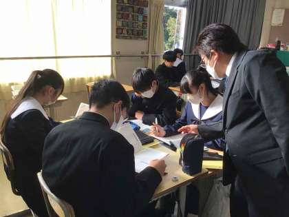 3年生の英語科の学習では、英文で書かれた内容についてグループで教え合ったり、学習用タブレットを活用したりして内容をつかみ、要約して発表する学習に取り組みました。書かれている内容について自分の考えをもつ時間も設け、深く思考する学習を進めていきます。