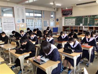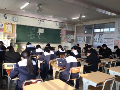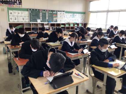 写真は2年生が国語科のテストを解いている様子です。