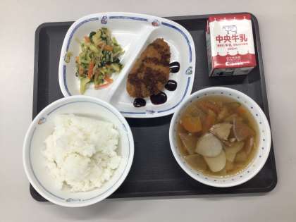 今日の献立は、ごはん、かしわ汁、アーモンド和え、ホッケフライ(ウスターソース(、牛乳、でした。エネルギー:802kcal