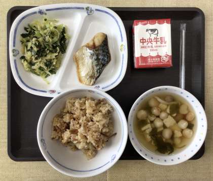2/17 今日の給食 公開日 2025/02/17 更新日 2025/02/17 各学年から 今日の献立は、三河赤鶏五目ごはん、ふだま汁、野菜の練りごま和え、鯖の塩焼き、牛乳、でした。エネルギー:820kcal