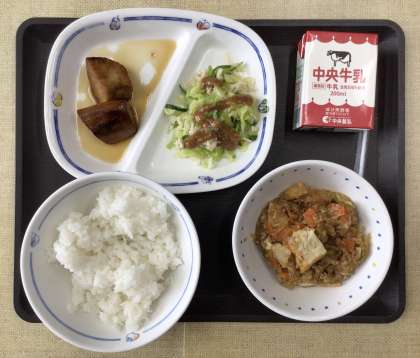 今日の献立は、「豊田ブランドの日献立」で、ごはん、ピリット厚揚げ、棒棒鶏(バンバンジー)◇棒棒鶏ソース、大学いも、牛乳、でした。エネルギー:839kcal