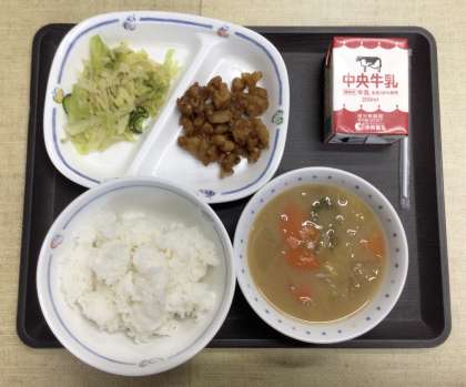 2/28 今日の給食 公開日 2025/02/28 更新日 2025/02/28 各学年から 今日の献立は、ごはん、米粉団子汁、たくあん和え、レバーと大豆の甘辛煮、牛乳、でした。エネルギー:837kcal