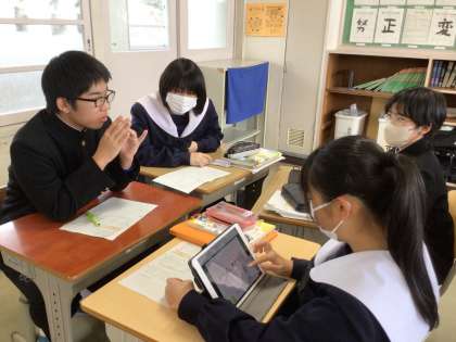 訓読文を書き下し文に直した後、タブレットの発表ノートを使って意味をグループで話し合い、全体で整理していきました。そうすることで、起句、承句、転句、末句の四句からなる漢詩の転句の役割に気付きました。