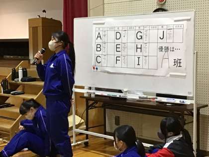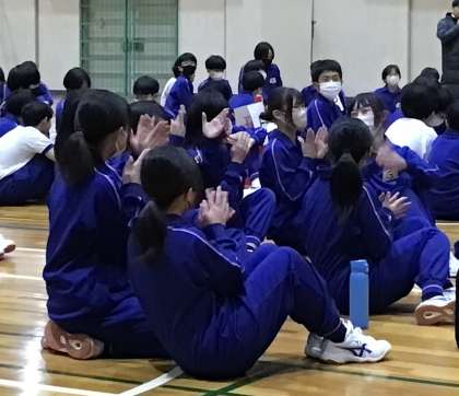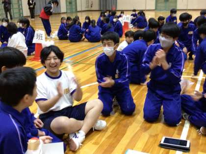 3年生が卒業を前に、「後輩に感謝する会」をしたいと企画して全校レクリエーションを実施しました。石野すごろくと称し、止まったコマに応じて用意されたゲームを全校で楽しみました。自分たちで考え、動き、やり遂げる力は後輩の手本です。楽しそうな笑顔が体育館にあふれました。
