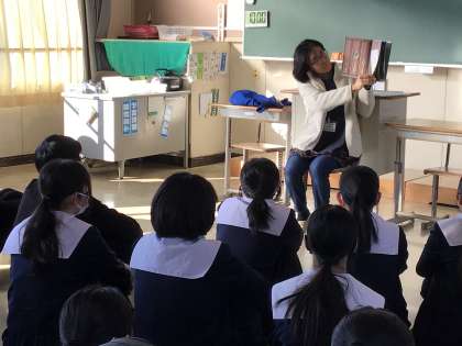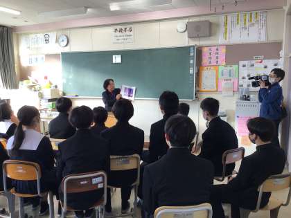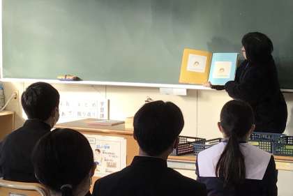 地域学校共働本部の協力による読み語りがありました。ひまわりネットワークの「じもちゅう」の取材が入りましたが、生徒は集中して本の世界に入っていました。