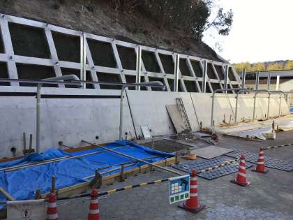 体育館の空調工事は終盤に入っています。体育館の外には室外機が設置されました。使用ができるのは来年度ですが、順調に工事が進んでいます。体育館東側の土砂崩れ防止工事も進んでおり、工事に伴い撤去されていた駐輪場の設置が進められています。駐車場や学校開放事業等で長期間ご不便をおかけしていますが、もうしばらくの間、ご協力をお願いします。