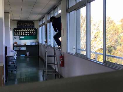 2月も最終週となり、3年生は卒業式を強く意識して生活しています。年度末を迎えるにあたり、校舎内外の整備を進めています。2月25日は、朝からガラス清掃業者の方が学校中のガラスを磨いてくださいました。生徒の心だけでなく、施設面でも気持ちよく年度末が迎えられるように動いています。