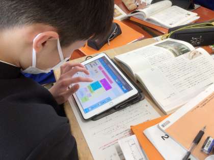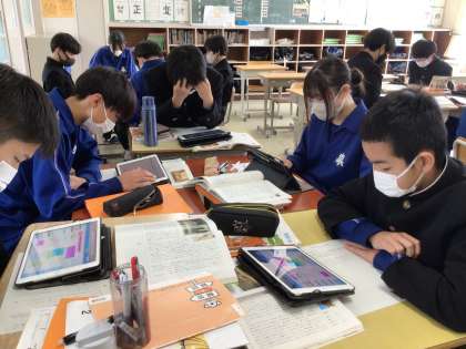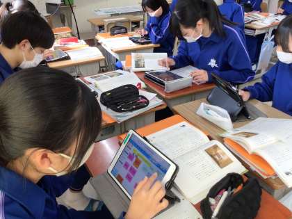 まずは「君は最後の晩餐を知っているか」の教材を使って、評論の文種、表現の工夫について考えました。タブレットのスカイメニューを使って、各自で考えたことをグループで共有しました。