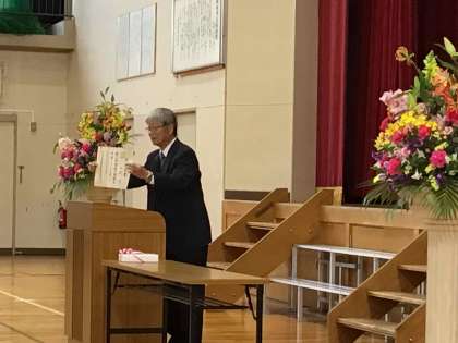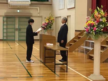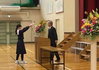 3月5日に同窓会入会式を行いました。同窓会副会長の中根様から、ご自身の中学校卒業証書を見せていただきながら、お言葉を頂戴しました。代表生徒による誓いの言葉が述べられ、同窓会から記念品が授与されました。