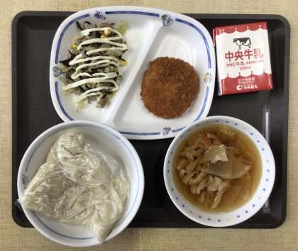 今日の献立は、「たべまるのおすすめメニュー」で、肉うどん(白玉うどん)、ひじきサラダ(マヨネーズ風ドレッシング)イカカツ、牛乳、でした。エネルギー:784kcal
