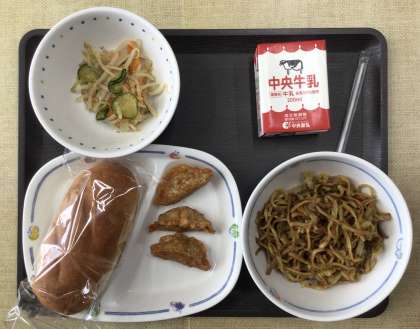 今日の献立は、米粉パン、焼きそば、ナムル、愛知の食材入り揚げ餃子、牛乳、でした。エネルギー:828kcal