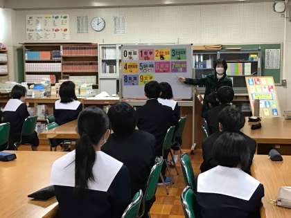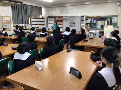 1年生は国語科の授業で図書館利用のオリエンテーションを受けました。司書さんから利用時の約束や図書の分類などについて説明を聞きました。生徒が多くの図書を読むことができるように支援していきます。
