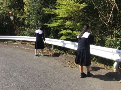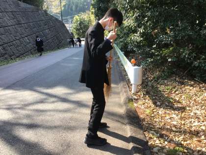 朝早く登校し、あいさつの坂の掃き掃除を行う3年生の姿があります。