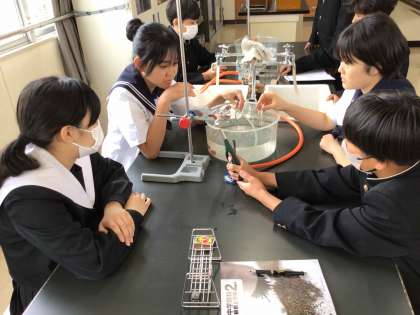 2年生の理科の学習では、炭酸水素ナトリウムを加熱すると起きる変化について実験、観察をしました。ガスバーナーが急に使えなくなるというトラブルが発生しましたが、他の方法で実験する臨機応変な対応も経験しました。