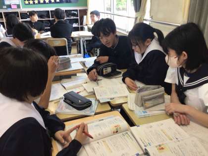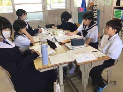 1年生の数学の授業では、負の数について学んでいます。「マイナス12冊多い」と「12冊少ない」は、同じ意味であることを納得できるようにグループで話し合い、全体で共有しました。