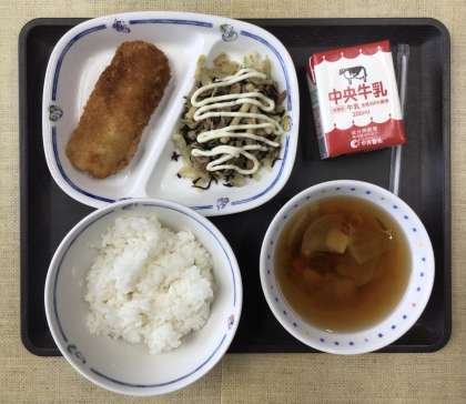 今日の献立は、ごはん、けんちん汁、骨太サラダ(マヨネーズ風ドレッシング)イカフライのレモン醤油がけ、牛乳、でした。エネルギー:819kcal