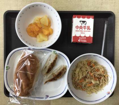 今日の献立は、米粉パン、炒めビーフン、ミックスフルーツ、餃子、牛乳、でした。エネルギー:807kcal
