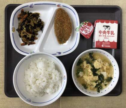 今日の献立は、ごはん、かきたま汁、スパイシーひじき(カレー風味)青じそ入り鯵フライ、プチゼリー(アセロラ)、牛乳、でした。エネルギー:788kcal