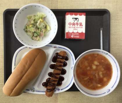 今日の献立は、サンドイッチロール、ミネストローネ、ツナサラダ、とんかつドッグ(中濃ソース・ドッグ用)、牛乳、でした。エネルギー:794kcal