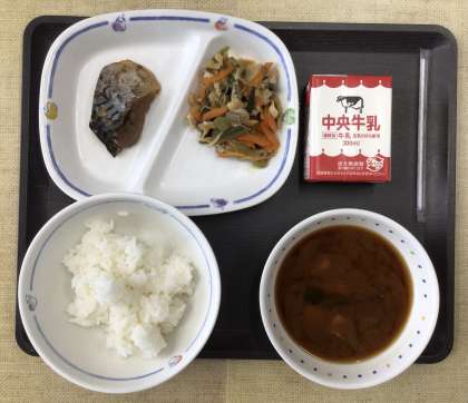 今日の献立は、ごはん、ジャガイモの味噌汁、山菜ごはん、鯖の煮つけ、牛乳、でした。エネルギー:805kcal