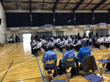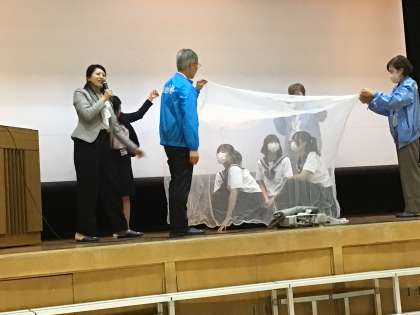ユニセフ協会の高円承子様、楢府奈緒子様から、ユニセフ活動やSDGsについてのお話をいただきました。また代表生徒による体験活動「水がめ運び」や「蚊帳体験」もあり、こどもの権利について、たくさんのことを学ぶ機会となりました。
