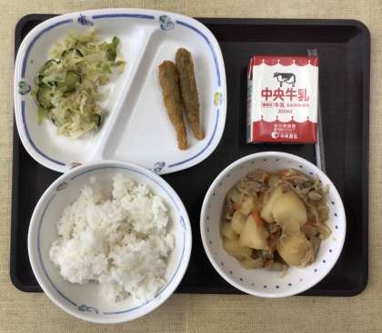 今日の献立は、ごはん、肉じゃが、たくあん和え、めひかりフライ、牛乳、でした。エネルギー:815kcal