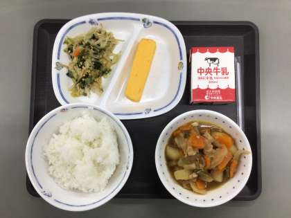 6/10 今日の給食 公開日 2025/06/10 更新日 2025/06/10 各学年から 今日の献立は、ごはん、鶏肉と野菜のうま煮、煎り大豆和え、厚焼き玉子、牛乳、でした。エネルギー:795kcal