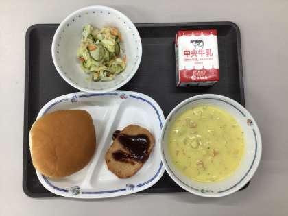 今日の献立は、サンドイッチバンズ、コーンチャウダー、アーモンドサラダ、ハムバーガー(中濃ソース・バーガー用)、牛乳、でした。エネルギー:736kcal