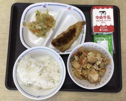 今日の献立は、「愛知を食べる学校給食の日メニュー」で、ごはん、生揚げの卵とじ、おひたし、にぎすフライ(ウスターソース)抹茶ふりかけ、牛乳、でした。エネルギー:866kcal
