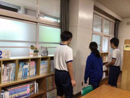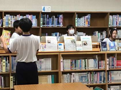 昼休みの図書室に足を運んでみました。司書さんが勤務される日で、図書委員の生徒が司書さんのおすすめの本を紹介するために、写真を撮影する場面に出あいました。読みたいジャンルの本を探す生徒の姿もありました。図書室利用生徒は多くはありませんので、図書室の利用率が上がる取り組みを工夫する必要があります。