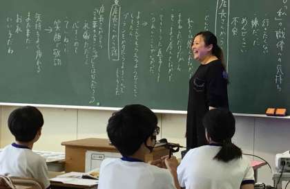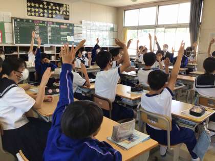 1・2年生の道徳科の授業では、「あいさつ」を題材にして話し合いをしていました。2年生は職場体験学習で必要とされるあいさつを、1年生はだれにでも気持ちのよいあいさつができるか、考えていました。