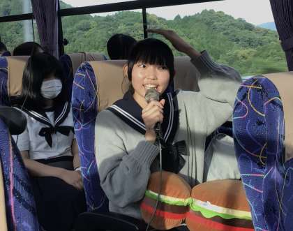 帰り道は渋滞がありましたが、ほぼ予定通り到着できそうです。バスの中で、一人ずつ修学旅行の思い出をマイクを使って話し、楽しかった時間を振り返っています。