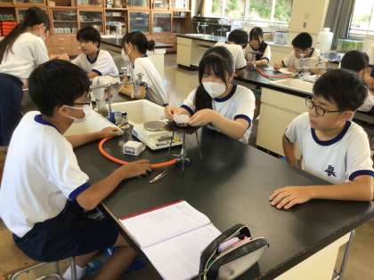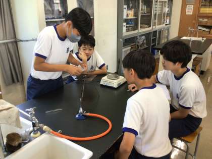 2年生の理科の学習は、「2種類の物質が結びつく時の質量」について実験をしました。銅を燃焼させて酸化させ、質量の変化を調べました。理科室での実験は、わくわくした生徒の姿を生み出しています。