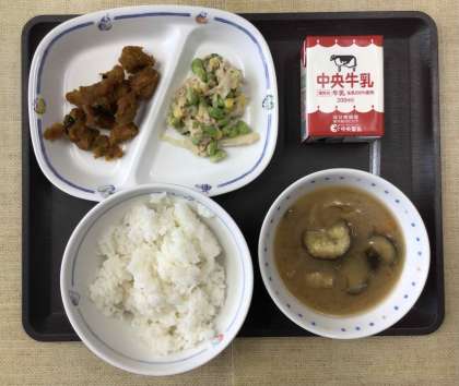 7/14 今日の給食 公開日 2025/07/14 更新日 2025/07/14 各学年から 今日の献立は、ごはん、夏野菜の味噌汁、枝豆サラダ、レバーとカボチャの甘辛煮、牛乳、でした。エネルギー:888kcal