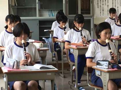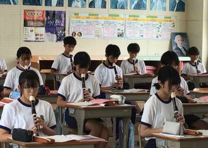 1年生の音楽では、アルトリコーダーの練習に取り組みました。ソプラノリコーダーとは異なる指使いに気を付けて、みんなの息をそろえて正しく演奏できるようにしました。