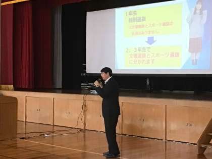 私立・専修学校の先生方をお招きして、高校説明会を開催しました。高等学校の学費の無償化についての情報を含め、各校の特色を知る貴重な機会になりました。進路選択をする際の参考になる話ばかりで、真剣に聞く3年生、保護やの姿が印象的でした。