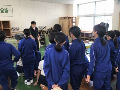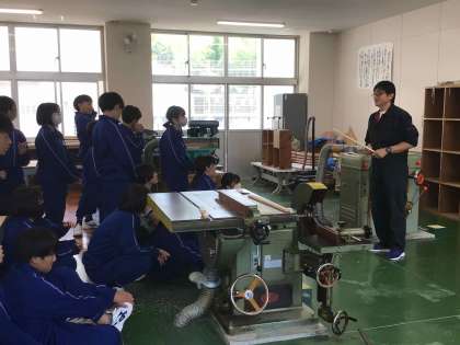 1年生の技術では、電動カンナの扱い方について注意事項の説明をしっかり聞きました。誤った使い方をすると取り返しのつかない怪我につながるため、どの子も真剣に聞くことができました。