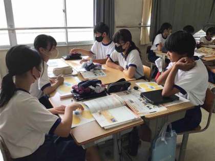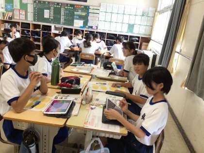 1年生の保健体育の授業では、スポーツとのかかわり方について学んでいます。それぞれの考えを学習用タブレットを活用して聞き合いながら、多様な考え方にふれています。
